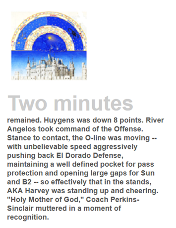 Set in September 1989, Chapter Three of Forward Progress on the Fields of Play. will soon begin. On the eve of Huygens Tech's opening game against the Humboldt Rangers, Caydance's studio class on Artists Books will begin with medieval manuscripts. And (in an authorial search of how a French medieval Book of Hours might have arrived in Italy) in opening paratexts, how in the 15th Century Charles VIII of France invaded Naples will be disclosed.