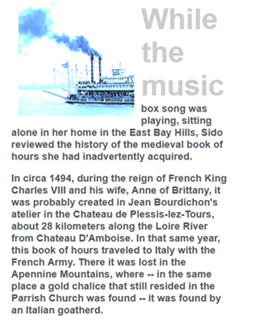 The narrative will unfold, as did an enigmatic work of art in book form, primarily from Caydance's point of view. Caydance herself will soon be prepping for her fall class in artists books. Additionally, she will be working as a consultant for Sido, the black curator who hired her to find the artist who created the music box in which a medieval manuscript was hidden, And, she has accepted a job writing about electronic art for Northern California Edition of MicroCurrents, a newspaper about California computer. This part of the narrative will be based on my own work as a Contributing Writer for MicroTimes , but will need to be a fictional publication since I did not begin writing for MicroTimes until 1992)