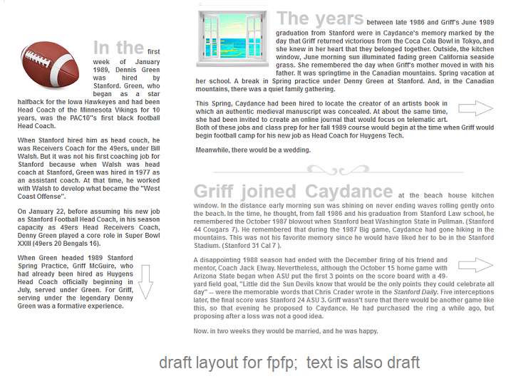 Meanwhile, Chapter One of Forward Progress on the Fields of Play has been completed. In this chapter, when Caydance's father hosts a rehearsal dinner at a sports bar, a surprising Best Man arrives; on the sides of the O'Brien Company car, Caydance's students airbrush a color-laden hyperreal mural of seductive football equipment and suggestive art supplies; and against a background of continuing wakes for John Matuszak, the wedding of Caydance and Griff takes place in a chapel in San Francisco. Meanwhile in the paratext, the details of Griff's new job are revealed, and Claude admits that it was not velocity to jump calculations that long ago attracted him to a young French Canadian figure skater. See the examples below for a sample paratext and two sample lexias.