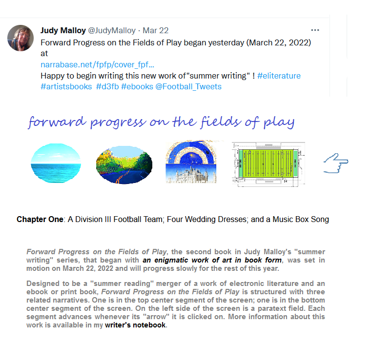 With this in mind, my plan is to seek a publisher for the print version of Forward Progress on the Fields of Play. Whether or not the digital version remains up will depend on negotiation with the print publisher. It should also be noted that while the images in the electronic literature version are necessary to hold reader attention in a virtual environment (that has different reader expectations of length), in a print version, elimination of images has the potential to contribute to the immersion that print writing elicits with writing alone. Thus, it is my plan to eliminate the images in the print version of FPFP.