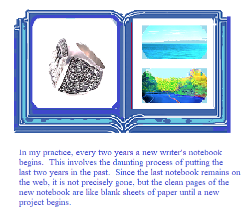 It is at this point in the start of a new work that a notebook is helpful not only in developing ideas but also -- as is necessary when coding is combined with research and words -- in focusing on where to begin. Sometimes it seems that there is so much work that needs to be done before the writing of Forward Progress on the Fields of Play begins that suddenly I need to go for a walk or study the availability of snacks.