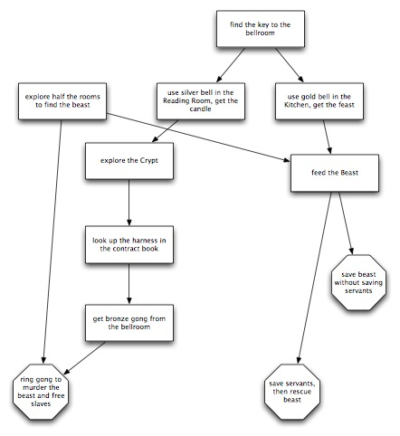 Not so bad for two hours, but from a story-telling perspective, this structure has problems. The contract book, one of the most interesting items in the game, is not required for either ending, so the player might breeze by it entirely. Meanwhile, the bronze gong is stored openly in the Bellroom, so it's possible for the player to find and use it without ever learning its purpose. A natural preliminary would be to put this information in the contract book -- and then refuse to let him use the gong until he's read that passage. So let's say that some of the bells in the bellroom don't become available until the player has already read about them. That makes sense: we're told that the room is full of bells, but we don't recognize all of them. The player will need the candle in the reading room to read the contract book anyway, but we'll also protect the secret of the elephant harness by putting the whole Crypt area in darkness. This is really for the player's benefit: it will stop him trying to use the things down there (which are only interesting once he has the contract book) until he has solved the light puzzle. Thus we cut down the number of leads he has to follow at a time and make sure that he discovers information in a somewhat sensible order. And, while we're at it, we'll put a lock on the Bellroom door to ensure that the player has navigated other parts of the map before he gets there. We don't want him ringing any of the bells too early.