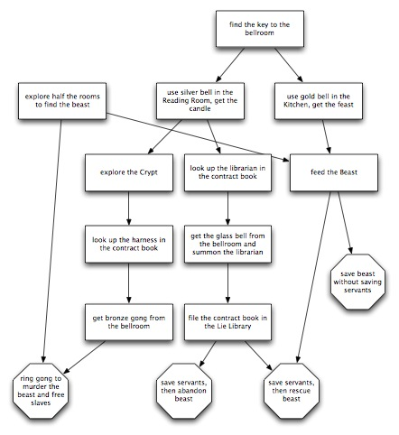 Notice the trapdoor puzzle is still sort of free-floating at this point. I haven't decided what to do with that yet, but I like the idea, so I'll keep it in there. At this point I also decide I want to restructure the endings, because some of them are still more difficult to reach than others. How about saying that the gong brings revenge on the beast, but does not free the servants? Then we get: