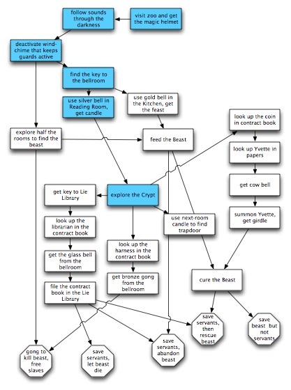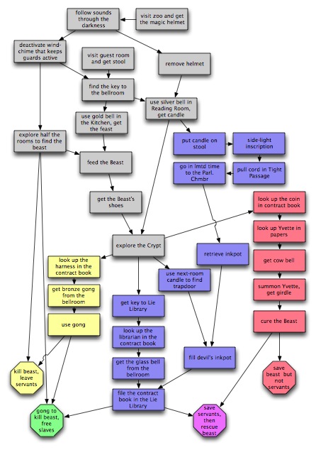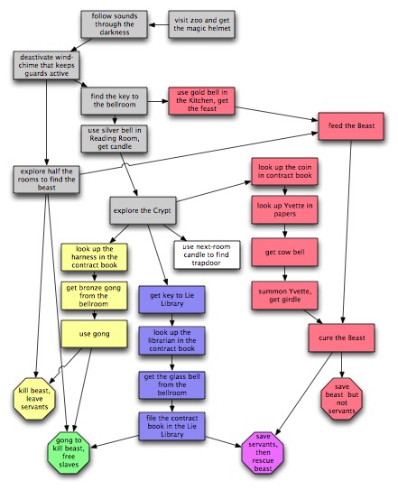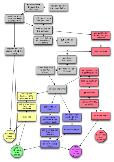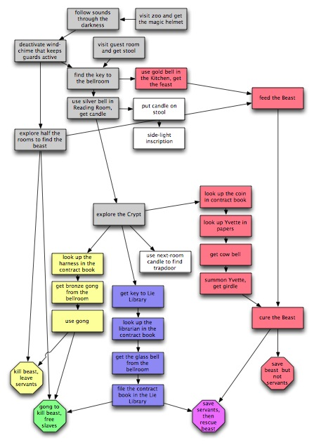 My next concern is that the branch with the feeding of the Beast (if we don't also save the servants) is very short and not very interesting. Besides, I'd like to sneak in some more backstory about how the Beast got to be like this. What to do about that? Add a whole additional puzzle: he's been made into a Beast, after all, so what if we also have to do something to free him from that condition? Traditionally the cause is an enchantress who punishes the Beast for some unkind act -- selfishness, or failure to see beneath a person's appearance. But I had a more specific history in mind: the Beast's particular crime is that as a young man he used to bring women he fancied to the castle, whereupon they would be unable to resist his wiles. One woman so brought turns out to have magic powers of her own, and when she realizes what is about to happen to her, on the drawbridge before the castle, she casts this curse on him. I don't want to completely remove the elements of the original tale: we'll keep the kiss as an element of the puzzle. But there has to be more to it than that. Perhaps the player needs to be wearing something unusual: I recollect a business with a magic girdle from Sir Gawain, which has the right flavor for this story. So we say the player has to have that. We also say he has to get it by consulting with the spirit of the dead woman who cursed the Beast, by scrying in one of the mirrors. That gives us an excuse to require the player to find an object in the Crypt area, look it up in both the contracts book and the paperwork, and then use the hint in the Scrying Room to perform the actual summoning up in the Bedroom -- making good use of several parts of the map that have previously been neglected, and guaranteeing that he does use the papers at least once. This is starting to get complex, so for the sake of clarity, I also colored the nodes that the player MUST experience to get to any one of the endings: