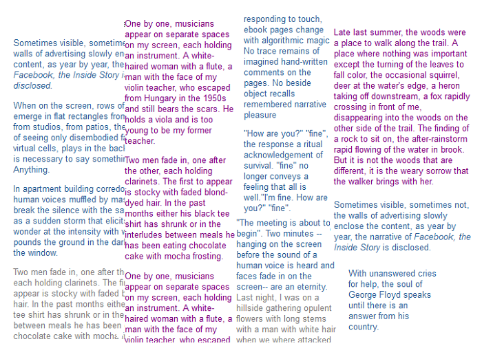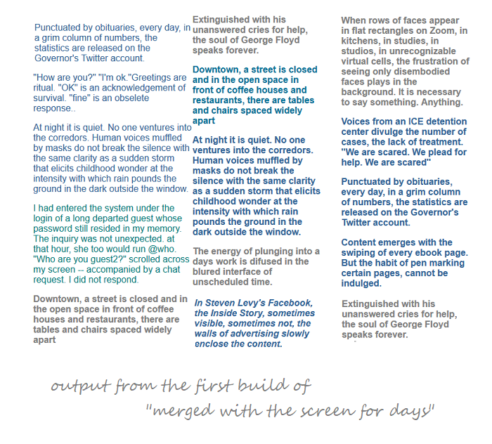 As evidenced in the August 24 output (above}, in the past three weeks, more lexias have been written; the work has expanded to four columns; and I am beginning to increase the color fields. There is still nowhere near enough text written, but I have until December to finish this work. Happy that I'm beginning to enjoy working on "Merged with the Screen for Days", and slowly it is becoming what I seek -- an ever-changing word picture of the year 2020. It is anticipated that as the work nears closure, sound will also be generated, text will fade in and out, and the work may also include images. August 4, 2020 I nside, as a tropical storm passes through New Jersey, listening to the rain and wind howling outside. In California, where I lived most of my adult life, the storms did not usually remind me of childhood in Massachusetts and New Hampshire, but here, I am reminded of the sound of the rain in New England, and my mother setting out paper and watercolors on a long table. I remember painting a hazy view to the sound of the storm. I remember retiring to my solitary bunk with my notebook. The largest problem with the initial work on "merged with the screen for days" remains that it is not engaged enough with the experience -- that it does not adequately reflect the experience. After rewriting a good portion of the initial variables, it is working a little better. Although it is my practice to record early struggles, today -- because there is still a problem with the voice of the narrative -- I am reluctant to post clear output. Images of in process work are an exposure of unfinished work and are not meant to be easily read by an audience. As regards the UI, what did not work last week was putting each lexia into a box, with the intention of creating a whole that looked like windows. The problem was that the whole looked like windows in a jail. To a certain extent, we are all in a COVID-seclusion prison, but because I see this work more as emulating the experience of online lives, at this point in time, no trace of last week's cells remains in the interface.