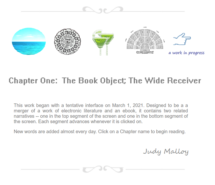 On January 1, 2022, I finished the writing for an enigmatic work of art in book form. January editing of this work was an intense process, but yesterday I finished the preliminary edits on the nine chapters of this work, and I completed the manuscript for a potential print version. There will, I imagine, eventually be more editing. Nevertheless, a few inconsistencies have been addressed, and this morning I am happy with the music box melodrama that unfolds in this work. Ebooks differ from electronic literature in that they do not utilize the computer-media platform to invite readers to explore computer-media narratives that immerse readers in interactive reading. My vision for an enigmatic work of art in book form. was to create a work of electronic literature that readers now accustomed to ebook reading would be comfortable reading -- and in the process to introduce electronic literature to a wider public. I was also interested in creating an interface that would transfer seamlessly to a print-based work. A few notes: 1. Although contemporary fiction writers and readers are comfortable with filmic moving back and forth between different but related parts of the narrative, the basic print and ebook interface is sequential page turning. In contrast, reader interaction with and exploratory traversal of multi-linear narrative are core affordances of electronic literature authoring systems. Creating a bridge between electronic literature and print writing, an enigmatic work of art in book form contains two related narratives -- one in the top segment of the screen and one in the bottom segment of the screen. Each segment advances at the will of the reader. Thus, the authoring system I designed for Enigmatic gives the reader control of what part of the narrative to follow, but the two narratives are relatively sequential. This affordance could be programmed into an ebook version. Or in a print version, it would be possible for a reader to page through either the top or bottom narrative stream and then -- at any point in the reading -- return to read the other stream. 2. From its name was Penelope to Arriving Simultaneously on Multiple Far-Flung Systems, female protagonists in the arts or in tecnology have been at the core of my works of hyperfiction, generative hyperfiction, polyphonic narrative structures, and interactive electronic manuscripts. Set in 1986 in the Northern California Bay Area and inspired by the importance of teaching in the exploratory arts, "an enigmatic work of art in book form" introduces Caydance Skye O'Brien, an art school-based adjunct professor, who teaches the lineage and creation of artists books. 3. Because I am also interested in the role of both the arts and sports in contemporary culture, the second protagonist, Griff McGuire, is a former NFL wide receiver, who is currently a graduate assistant coach at a San Francisco Bay Area University. As Caydance and Griff slowly build a relationship, at the core of an enigmatic work of art in book form are two cultures that are sometimes linked together as entertainment -- although from the point of view of both dedicated athletes and dedicated artists, "entertainment" is seldom the word of choice. 4. Utilizing interactive affordances that should be possible in ebooks, "enigmatic" explores potential bridges between electronic literature and print writing, and in the process an enchanting narrative unfolds. This work was intended to be a one of a kind work that would be completed in one year. But it is not uncommon for writers to become immersed in the worlds of their own creation, and I confess that I am reluctant to emerge from the world of an enigmatic work of art in book form