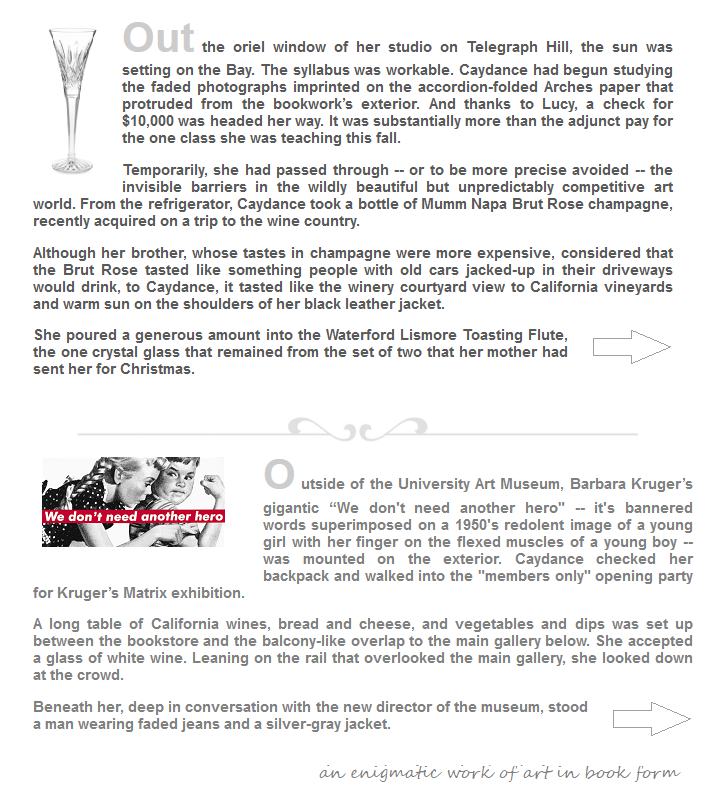 The latter is of particular interest because in my narrative, Caydance had already met Griff. When I searched for what was exhibited at UAM at about that time, I was surprised at how appropriate Kruger's exhibition was. (Barbara Kruger, MATRIX 100, August 15–October 21, 1986). Like everyone else in Berkeley at that time, I had seen her huge poster on the Museum's outside walls. Remembering the many years when we did not have search engines, once again I am reminded how search engines, which (for better or worse) we now take for granted, have altered the lives of all for whom information is important.