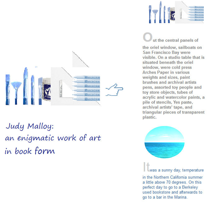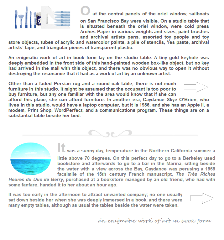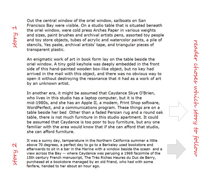 The basic structure for an enigmatic work of art in book form will be a dominant story accompanied by parallel stories. Although, contemporary fiction writers and readers are very comfortable moving rapidly back and forth between different but related parts of the narrative, the basic interface of ebooks is print book sequential page turning. My vision is to work with this narrative device (which may or may not have been somewhat influenced by both film and by electronic literature), but in the process to give the reader more control of what part of the narrative to follow. After abandoning more complex designs, I am currently considering screens that look like pages but -- by offering the reader a choice of which thread to offer -- behave with low interactivity. Obviously, this is basically an historic "choose your own adventure" structure. However, the goal is make this structure look like an eBook that readers are now accustomed to - as opposed to something different. And as Pavel pointed out long ago, the narrative itself is important in this respect. The mockups look like this: ![]() ![]() ![]() Note that the text in these mockups is rough draft, and that more arrows are likely to occur when -- as more plotlines are added to the narrative -- the complexity slowly becomes greater. The narrative the reader is following is currently shown in larger text than the alternative. Different colors may be more effective, although that would distract from the ebook look and feel. January 31, 2021 ![]() Out the central window of the oriel window, sailboats on San Francisco Bay are visible. On a studio table that is situated beneath the oriel window, are cold press Arches Paper in various weights and sizes, paint brushes and archival artists pens, assorted toy people and toy store objects, tubes of acrylic and watercolor paints, a pile of stencils, Yes paste, archival artists’ tape, and triangular pieces of transparent plastic. I t is a pleasure to plunge into the writing of a work that expands the boundaries of electronic literature practice. Not since Dorothy Abrona McCrae -- a work that consistently receives more "hits" than much of my other work -- have I succumbed to a narrative that could be envisioned in the category of a paperback with appeal to a wide audience. The working title for this new work is "An enigmatic work of art in book form", but this title will probably be changed. As I wrote in the last notebook entry: My vision for this work is to create a work of generative fiction that people now steeped in ebook platforms will be comfortable reading. Much character and plot development and some writing have been done on "enigmatic" in the past few weeks -- enough to design a structure and to plan to reveal the first chapter sometime in February. But in the case of a work that centers on the solving of a mystery, it does not seem appropriate to detail plot development in a publicly available notebook. It might, however, be of interest to further describe the book that Caydance Skye O'Brien (yes, her name has been changed) receives in the mail. An enigmatic work of art in book form lay on the table beside the oriel window. A tiny gold keyhole was deeply embedded in the front side of this hand painted wooden box-like object, but no key had arrived, and there was no obvious way to open it without destroying the resonance that it had as a handmade object by an unknown artist. From a slot in the top of the book, a paper accordion-fold scroll partially emerges. Images on this scroll are children's toys, and text and landscapes from a childhood (presumably of the creator of this artists book). On the sides of the book are words and meticulously painted images that when carefully studied and researched might result in revealing the location of the key to the book. Some of these images are reproduced in the visual that begins this post. January 17-19, 2021 Since I began writing online notebooks 12 or 13 years ago, it has been traditional to begin a new work or a new part of a lengthy work in late January. Last year it was the sound for "the fabric of everyday life". This year, it is an as yet untitled new work of aleatoric fiction which I anticipate will take at least a year to code and write. Moving the generative structure of Arriving Simultaneously into a page-simulating aleatoric system and inspired by female protagonists in contemporary mystery stories (which in this pandemic era, I have been reading nonstop after running out of free movies), my new work introduces Allanah, a San Francisco-based adjunct professor, who teaches the lineage and creation of artists books. Jetting (on the long weekends between her midweek classes) to distant resorts and publishing her findings in obscure journals, Allanah explores art mysteries from the real past and the fictional present. In underlying narratives, which will appear when paragraphs are regenerated, personal details will be revealed -- such as the regular bank deposits from her art-supporting billionaire parents; and what happens when she meets a law student, whose past as an Oakland Raiders wide receiver is not immediately apparent. My vision for this work is to create a work of generative fiction that people now steeped in ebook platforms will be comfortable reading. But before I go too far in the background reading and in designing the structure (and before I actually begin writing this wishful thinking for adjuncts story, which I am anxious to do), it should be noted that in a new "about" file currently attached to merged with the screen for days , the dichotomy of structure and content in merged is expressed as follows: Simulating computer-mediated environments that dominated our lives in 2020, in merged with the screen for days, stanzas that move across a four-array structure play unpredictably together -- allowing, if the reader generates several versions, multiple views of the impact of screen-dominated isolation on everyday life. But