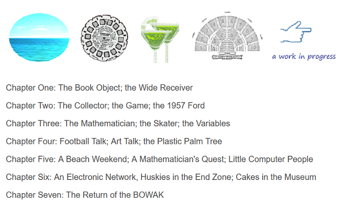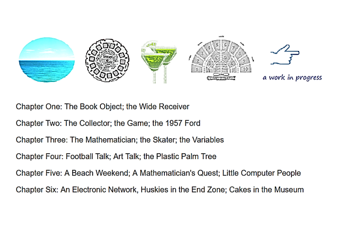 After each chapter is finished, a week or so of editing greatly improves what was written on the fly. Of course, more editing will need to be done when the work is completed. But on the whole, this adventure away from my generally more hypertextual and/or generative work was a productive post-pandemic excursion into the potential of print and digital authoring to co-exist. How enigmatic, will eventually fare in the wider world of print publication is not yet known. However, the process has been invigorating. And, as a work progresses, there is often for writers a feeling that the characters have seeped into our own lives. So it is with Caydance and Griff. A few Chapter Seven notes. ___As Caydance's class on artists books moves into accordion-fold books, online documentation from the Joan Flasch Artists' Book Collection, housed at the School of the Art Institute of Chicago's Flaxman Library, was the source of two works that Caydance presents to her students. They are: John Baldessari's proto-meme Fable a sentence of thirteen parts (with Twelve Alternate Verbs) Ending in Fable, published in Hamburg Germany in 1977. "The images were blurred black and white photographs appropriated from television or old movies that were not well-known enough (to her) to be instantly recognizable. The writing was a shade of yellow. The action of unfolding Fable was primary, as if the reader/viewer was immersed in a memory of forgotten images and emotions. 'friends' 'enter' 'intense' 'watch'." and Six Dances by Nancy Karp, the director of Nany Karp + Dancers. "When she opened the Six Dances box, six miniature accordion-fold books were revealed, each a visual symbol-laden score of a pattern dance that the company performed: First Light, Dot Bunch, Relay Relay, Running Dance. River Canon, Reminiscence....Other than the spare beauty of these concertina-folded leporellos, what she wanted to say to her class was that this was an example of inside a box, outside the box thinking -- of creating an artists book that had meaning that reached far beyond the spare markings that coded the geometric patterns of each dance." ___Contingently, in the course of writing enigmatic, I have been impressed by the complexity of football offensive/defensive systems that every week must fluctuate in relation to those of opposing teams. The 1986 Stanford Daily 's coverage of Stanford football games in that year has been very helpful in including details of these games in enigmatic -- thanks in Chapter Seven to coverage of the Stanford-Oregon Ducks game by Senior Staff Writer, John Lis. In his words about a memorable play in that game: "...Henley played a large role in putting the Ducks down. On the last play of the first quarter, he fielded a Mike Preacher punt at his own 8-yard line, broke through the first wave of tacklers, broke to the left sideline and stopped 92 yards later with the longest punt return in Stanford history." "'I just thought, 'I've got to get to the end zone,' Henley said. 'I knew when I broke it, no one would catch me.'" ___Caydance's visit to Carolee Schneemann's New York studio was based on my own visit to her studio in the early 1980s. (1982?) At the time -- as described in enigmatic, -- there was an intern there, cleaning dusty early assemblages, which I had never seen before and have not since seen. My recollection is that by 1986 when enigmatic takes place, Carolee - who was always welcoming to feminist artists and writers -- had begun working on the Venus Vectors work, which Caydance describes to her students. This work was installed the following year at the Emerson Museum of Art in Syracuse in the exhibition Sacred Spaces (January 23 - March 29 1987). Later, I solicited a paper on this work that was submitted to Leonardo in 1992 and published in 1994. In her words: "The 12 hinged panels comprising the structure of Venus Vectors suggest the pages of a huge open book. In this sculptural 'book', the transparent 'pages' and printed grids are multivalent and multidimensional. Iconographic associations with the 'V' shape are juxtaposed on the printed grids. On the monitors, my body -- the source of the vulvic 'V' -- is miniaturized within the two 13-in video screens; my actions and spoken text recur in 12-minute loops. This paradoxical shift in scale between viewer and performer intensifies perceptual intimacy." -- Carolee Schneemann, "The Blood Link: 'Fresh Blood: A Dream Morphology' and 'Venus Vectors', Leonardo, 27:1, 1994, pp 23-28. Available on JSTOR at https://doi.org/10.2307/1575945