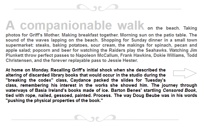 Note that the parallel growth of artists' video installations and sports bars had not occurred to me until I contemplated what Griff's experience would be. ___Sometimes The artists book world has beneath the surface been a battle ground between representation and idea, but in the exploratory/productive environment of art school there is in student projects an incorporation of different approaches. Contingently, in enigmatic, Caydance is initially selective about what she shows Griff -- choosing, for instance, to show him Two Places at Once: "On the studio table was Two Places at Once, an artists book she wanted to show him. Multiple accordion folded pages, unfolded from inside the book, revealing mountain ranges, lakes, and fields in which telephone lines were visible. The artist was Canadian: Marian Penner Bancroft, who taught at Emily Carr University of Art and Design in Vancouver." and not sharing everything that she saw in Carolee Schneemann's studio. Contingently, game plan secrecy (for not the same reasons) is important in football culture. "...a good opportunity for our offense to break through." Griff concluded his narrative, which had also encompassed Oregon's 2 wins 4 losses record; a multitude of injuries on the Oregon sidelines; and the usual disclaimer that he could not reveal Stanford's game plan and depth chart." On the other hand, after the game, Griff is happy to share the game film, which as part of his job as Graduate Assistant Coach, he is required to analyze. "...let's begin this perfect dinner you made", he said, eying the roast chicken and the gravy boat with interest. "I want to drink the Japanese beer your brother provided, think about beating Arizona in Tokyo, tell you stories of football game road trips. After dinner, this." From his overnight bag, Griff took the game film of the Stanford-Ducks game. Tossed it on the bed. If she was a doctor, and he was an industry-based computer scientist, every detail about their work as scientists would not be shared with each other, but it would still be possible to build a solid relationship. And, as Caydance and Griff slowly build a lasting relationship, at the core of enigmatic are two cultures that are sometimes linked together as entertainment -- although from the point of view of both dedicated athletes and dedicated artists, entertainment is seldom the word of choice. I have heard that there are those who object to the sharing of cultures in enigmatic. Really?