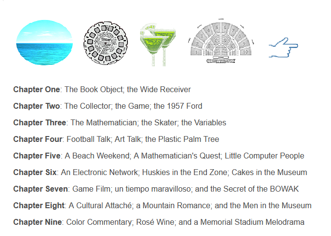4. an enigmatic work of art in book form continues to be a summer reading/summer writing narrative, which immerses the reader in a puzzle-solving situation, where new data continually emerges -- while at the same time there is an unexpected romance in which discussions such as the contingencies between multimedia sports bars and artists' video installations are of shared interest.
