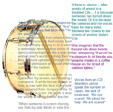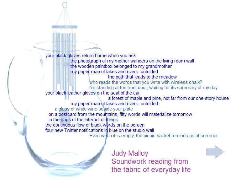 Every "play" is different because only sound from the variables that the code generates is heard, and, like the windchimes it represents, this is a fleeting work that should be played and replayed. And, because some of the variables do not contain sound, once in a while the windchimes are silent or play only a few phrases. Note that since the annual Electronic Literature Conference, ELO 2020, July 16-19 (originally to be hosted at the University of Central Florida) will this year be a combination of synchronous and asynchronous online events, my soundwork will be on an asynchronous performance/reading menu. Thanks to Anastasia Salter and her UCF colleagues for putting this now legendary elit event online!