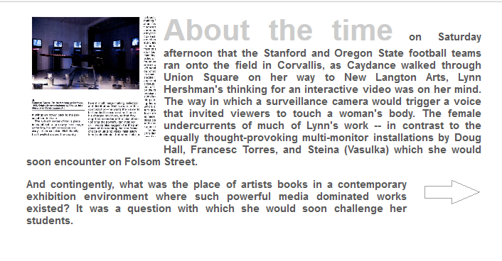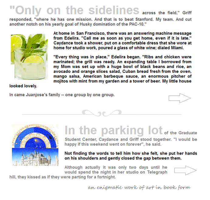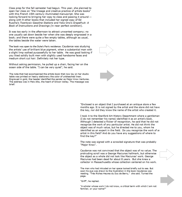 I kept to the structure of two lexias per page with one narrative in the top section and another narrative in the bottom section. In the process, many small changes were made in the look and feel. But finally, it is working! Below are examples of "pages" in an enigmatic work of art in book form. Note that because readers will advance lexias differently, the pages will be different for different readers.