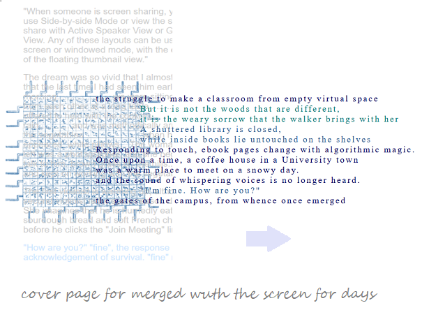 January 4-6, 2021 I n the past month, merged with the screen for days has emerged as the equivalent of a near final draft. In the process, many changes have been made. Because it is a poetic narrative about a difficult year, ultimately sound and dominant visual image were eliminated. Yes, the computer screen allows an approach to writing that includes sound and visual image, but that does not mean that the power of words alone should always be abandoned. Here are the changes that I made in the past month or so: ___After last month extolling the virtues of a cover for works of generative literature in the online environment, and after spending many hours working on the generative output for the cover, I eliminated the cover for merged with the screen for days. The amount of time I spent on the discarded cover was actually the problem because although I liked the cover, it detracted from the impact of the work itself. A new cover could be made, but it should probably only contain an image and basic information..