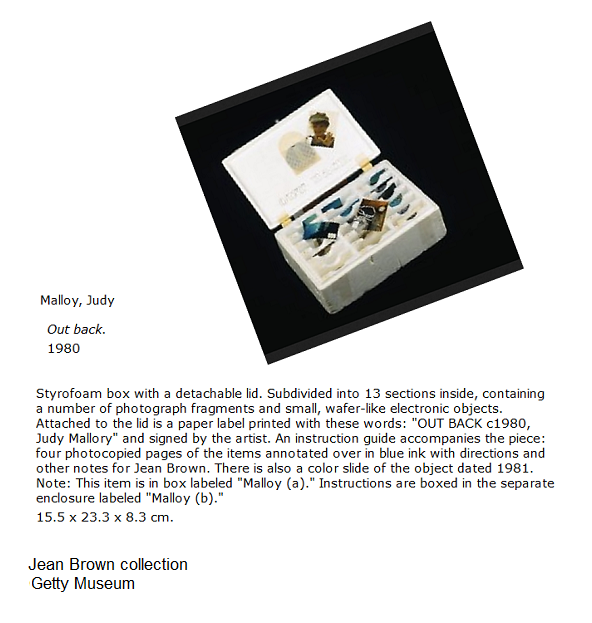 For instance, Jean Brown bought one of my early works (Out Back, 1980). Judith Hoffberg included my work in many of the artist book-centered exhibitions that she curated, including at ARTWORKS in Venice Beach, the artist books store that occurs in enigmatic and Artwords & Bookworks at the Los Angeles Institute of Contemporary Art in 1979, co-curated with Joan Hugo, with whom I shared a cabin at Deep Creek in 1994. ARTWORKS, the artists books store, was short lived, but my work was one of the first exhibitions there.