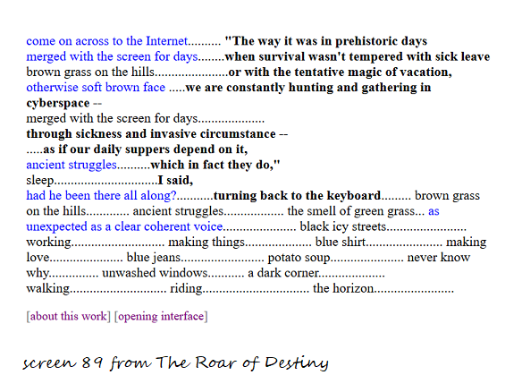 Writing to "merged with the screen for days" will, I anticipate, offer regular episodes of writing and coding in what I hope will be a busy fall of teaching and modeling social media semester. Because time may be short, and the subject is difficult, I have allotted four months to tweak the code and interface and to write and edit the variables. Maybe the interface will be redesigned with graphic elements. Maybe, this work will stand with only words. Onward! July 4, 2020 In search of a title for an incipient work, I went to The Roar of Destiny. It is not the first time that I have used a phrase from The Roar of Destiny as a title. Beginning in 1995, The Roar of Destiny was written while I was working online for Arts Wire (a program of the New York Foundation for the Arts). Arts Wire was run with a virtual office (meeting online from our homes -- which were variously in New York, in Michigan, in Massachusetts, in Seattle, among other places). I was logging on to AWSTAFF from the hills in El Sobrante, California. Usually, we spent most of our days online -- punctuated by telephone "help" talks with users and new users. (and in my case with crutch hikes in the hills and escapes to the Gold Country foothills and the High Sierras). In The Roar of Destiny, I represented this existence with a daunting interface of links that each led to a screen where -- surrounded by phrases -- the main text was bolded.