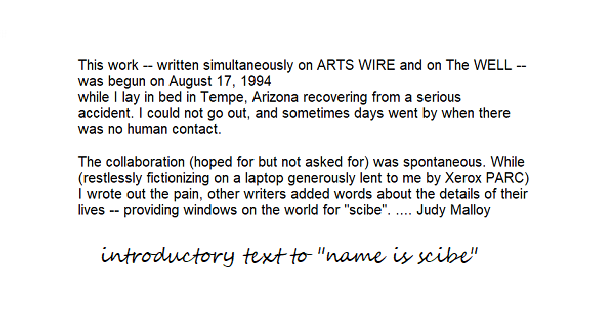 It is usually my practice when beginning a new work to return to earlier works. Some new media artists eschew the idea of consistent vision. This is viable considering the radical changes in software and hardware that continue to occur. But personally, although I do take into consideration such changes, I find it grounding to look at earlier interfaces and content. This is both a starting point -- a way of combating the blocks that sometimes occur when it is time to begin a new work -- and a way of reminding myself how I have approached certain issues in the past. Last week, the work I chose to return to was name is scibe, a collaborative work I began on August 17, 1994, about 5 weeks after I was run down on July 9, 1994. Because I do not like being reminded of my descent to a lifetime of crutches, returning to this work required a certain amount of courage. But I was interested in the 1994 Internet window to the world that is at the core of scibe. name is scibe began on two platforms -- the Interactive Art Conference on Arts Wire and the Arts Conference on The Well. It ran until late 1994 when I transferred the content to an early website, where it was one of the first narratives published on the World Wide Web. Initially, the web version was hosted on Arts Wire's webspace, but when it became apparent that Arts Wire was not likely to survive much longer, I moved it to The Well in 2001. Flashes of PTSD returned as I plunged into name as scibe. But they did not linger. Instead I came away with recollections of the responsive early social media "friends" and with wonder at the strong community that existed at that time on The Well and Arts Wire -- and of course what I sought: isolation then and now, and the differences between the Internet then and now. I was also interested in how scibe played in 1994 -- the year of the emergence of electronic literature on the fledging World Wide Web. For example, Sue-Ellen Case observes that: "Accretion replaces plot line as the signature of fiction-writing on the Net. The traditional time and ordering of space gives way to an absorptive electronic space, eddying different places into a common pool, which, while emulating the sequential in sites, overcomes its temporal axis. Malloy's call for company also promises an accretional, collecting culture production..." -- Sue Ellen Case, Eve's Apple or Women's Narrative Bytes,", Modern Fiction Studies 43:3, 1997. pp 631-650 That said -- because contemporary social media is more diffuse, and the bonds with other people are often not as close as they were in 1994 -- I am not going to repeat the collaborative aspects of name is scibe.