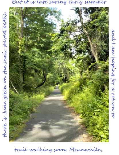 Everyone is suffering in one way or another these days. In my life, it has been a time of the death of a beloved cat, River 1999-2020, 21 year old rescued feral. It has also been a time that began with a broken foot on my bad (shattered, misshapen since a car ran into it 27 year ago) leg. Then there was walking rehab; setbacks; walking rehab; a sprained ankle on my good leg (that has done the majority of weight bearing for many years) and now walking rehab. But it is late spring/early summer, and I am hoping for a return to my usual crutch-aided trail walking soon. Meanwhile, there is June green on the semi-paved paths. June 8, 2020