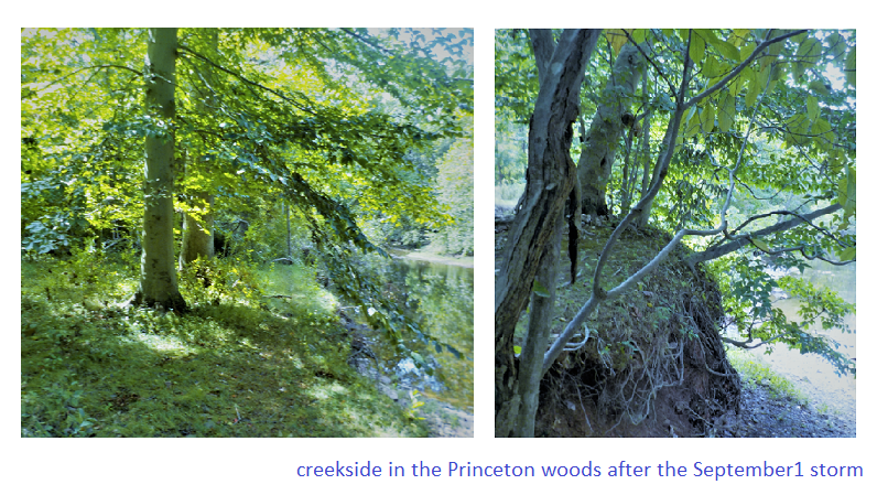 Hurricane Ida passed through New Jersey in a day long thunder and lightning downpour accompanied by high winds and tornados. On that day, near where I live, Stony Creek rose about 12 feet and carried away the top of a picnic table, where I sometimes sat to read or write. Trees and debris were strewn across the trails where I usually walk. Since that day, September 1, 2021, the woods have been unseasonably green.